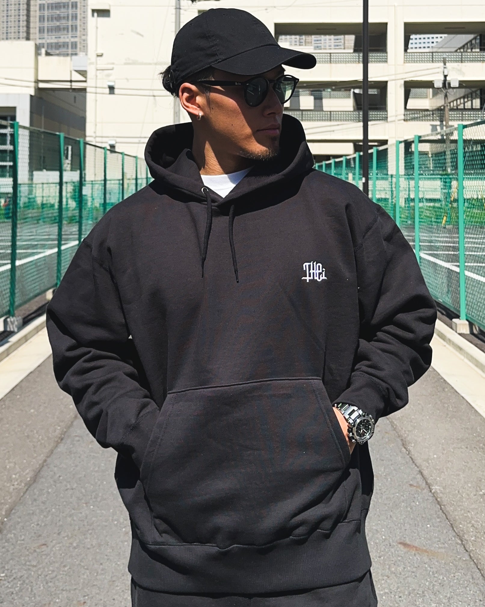 THEiのアラビックロゴを使用したヘヴィーウェイトのスウェットプルオーバーパーカー。