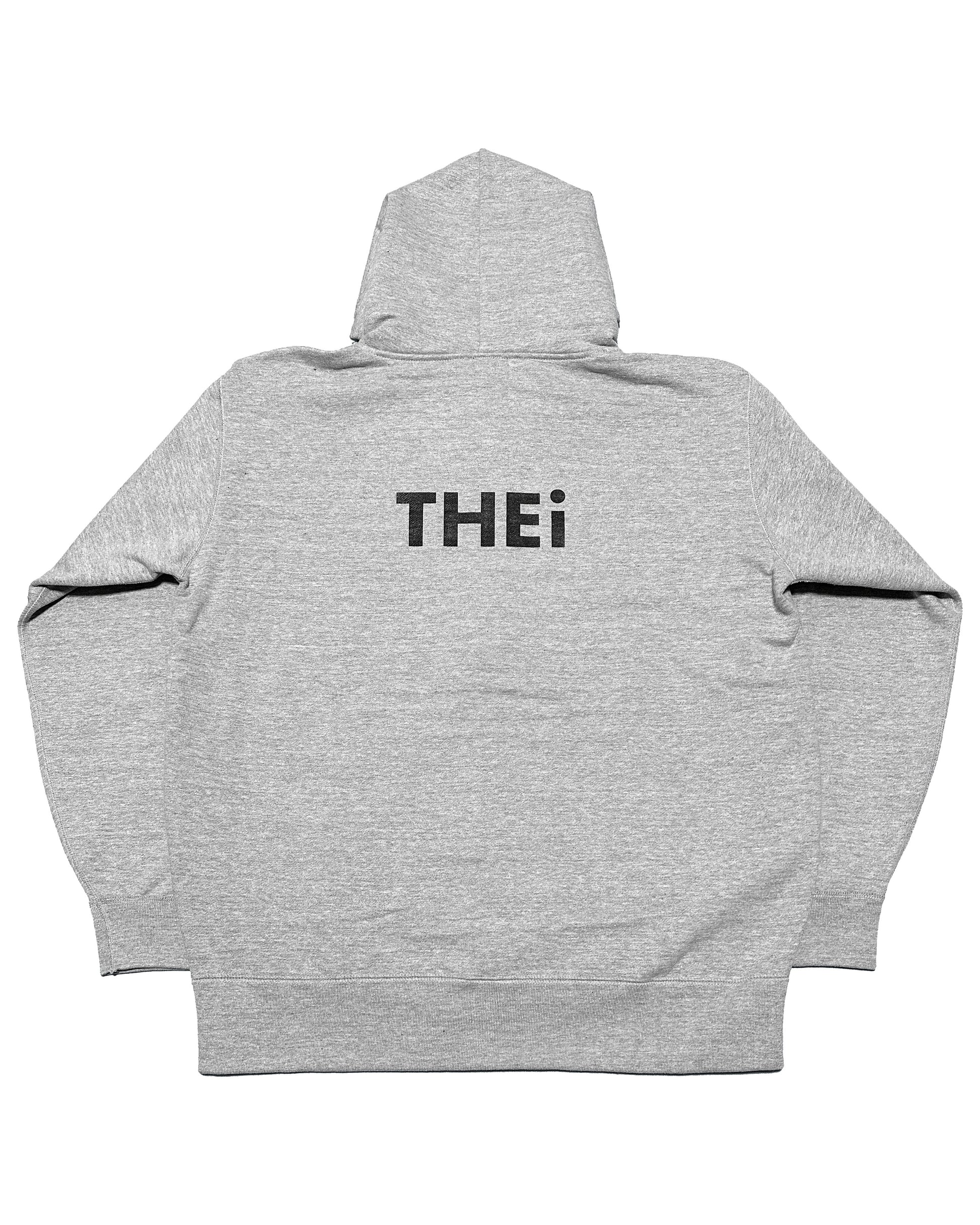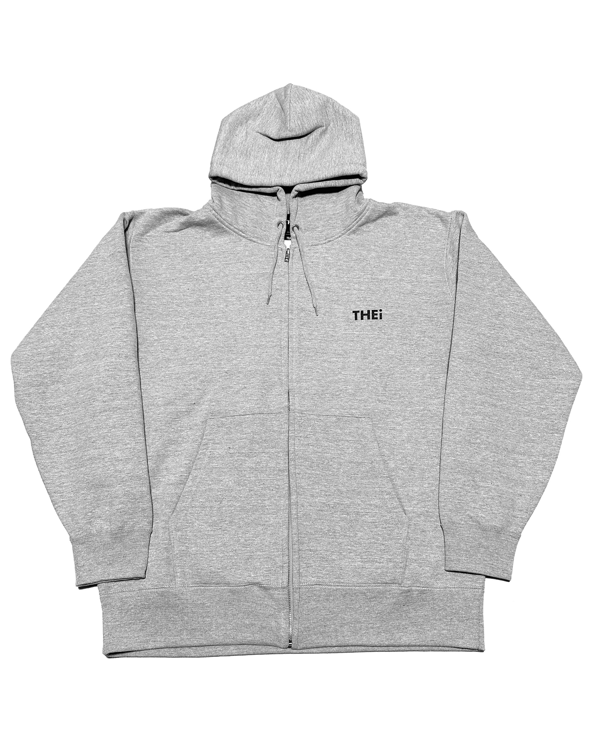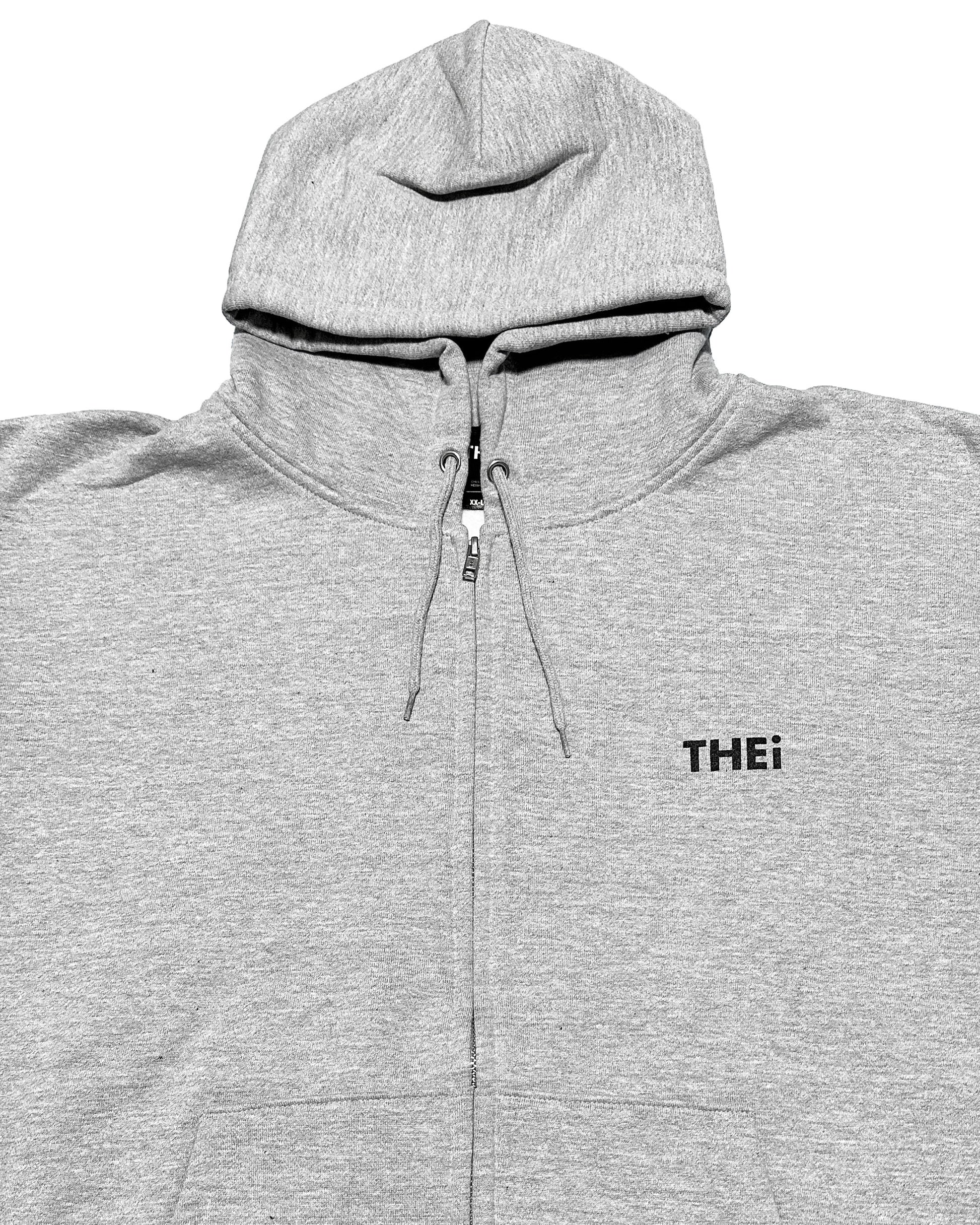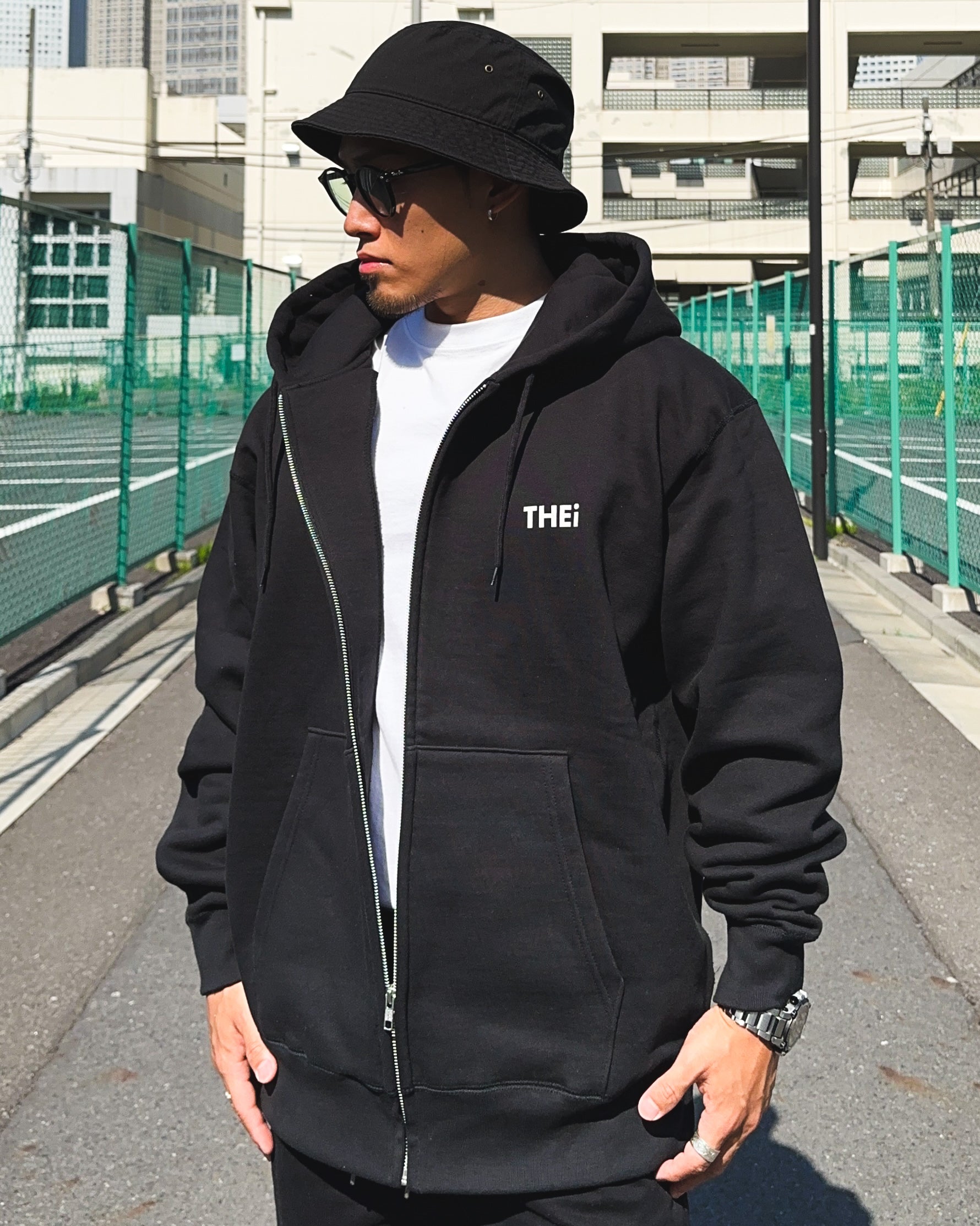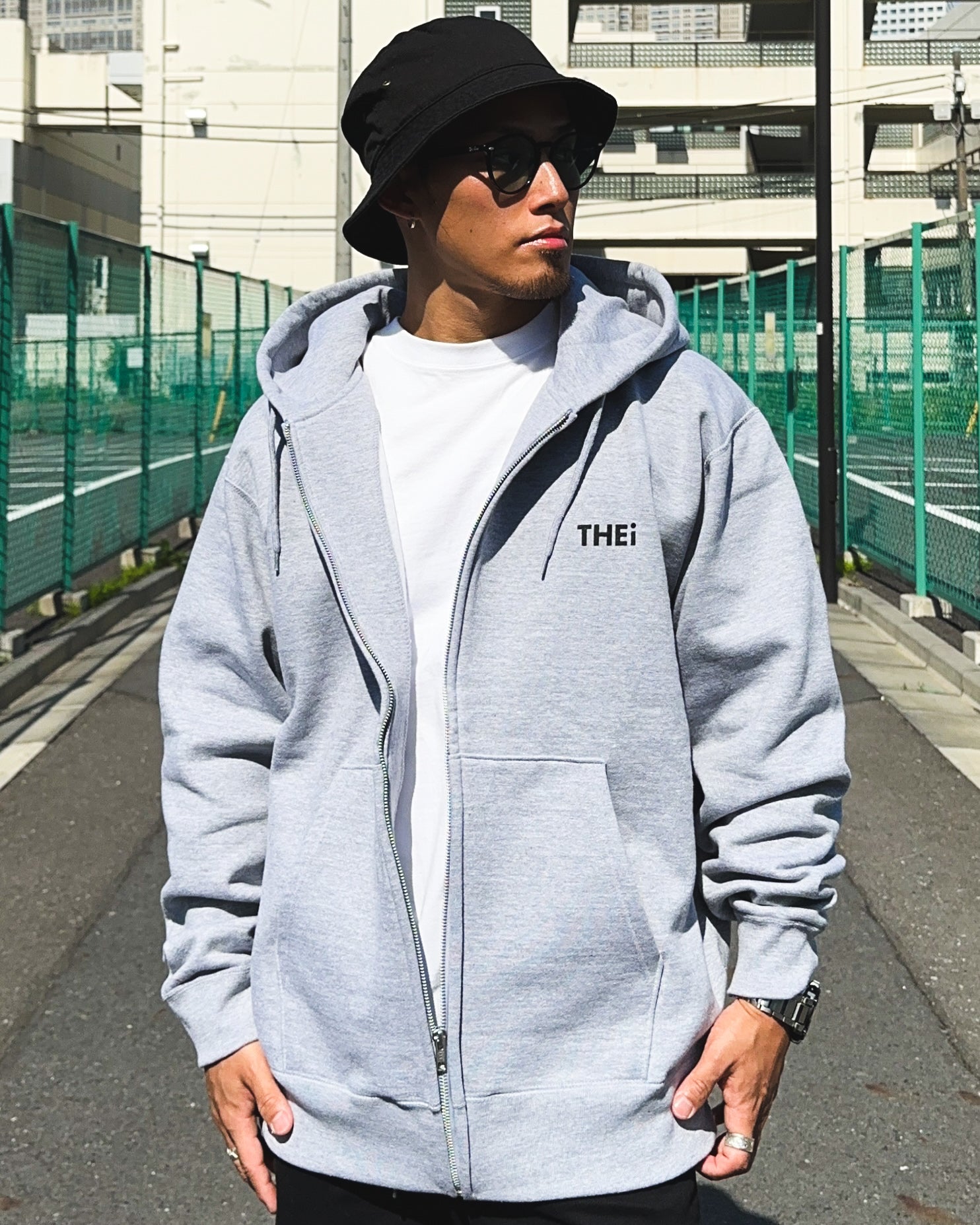 THEiのベーシックロゴを使用したヘヴィーウェイトのスウェットジップアップパーカー。