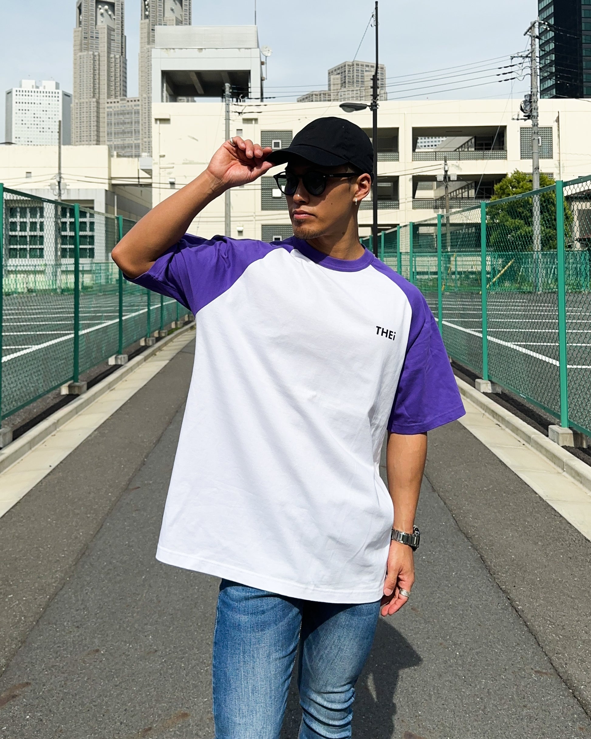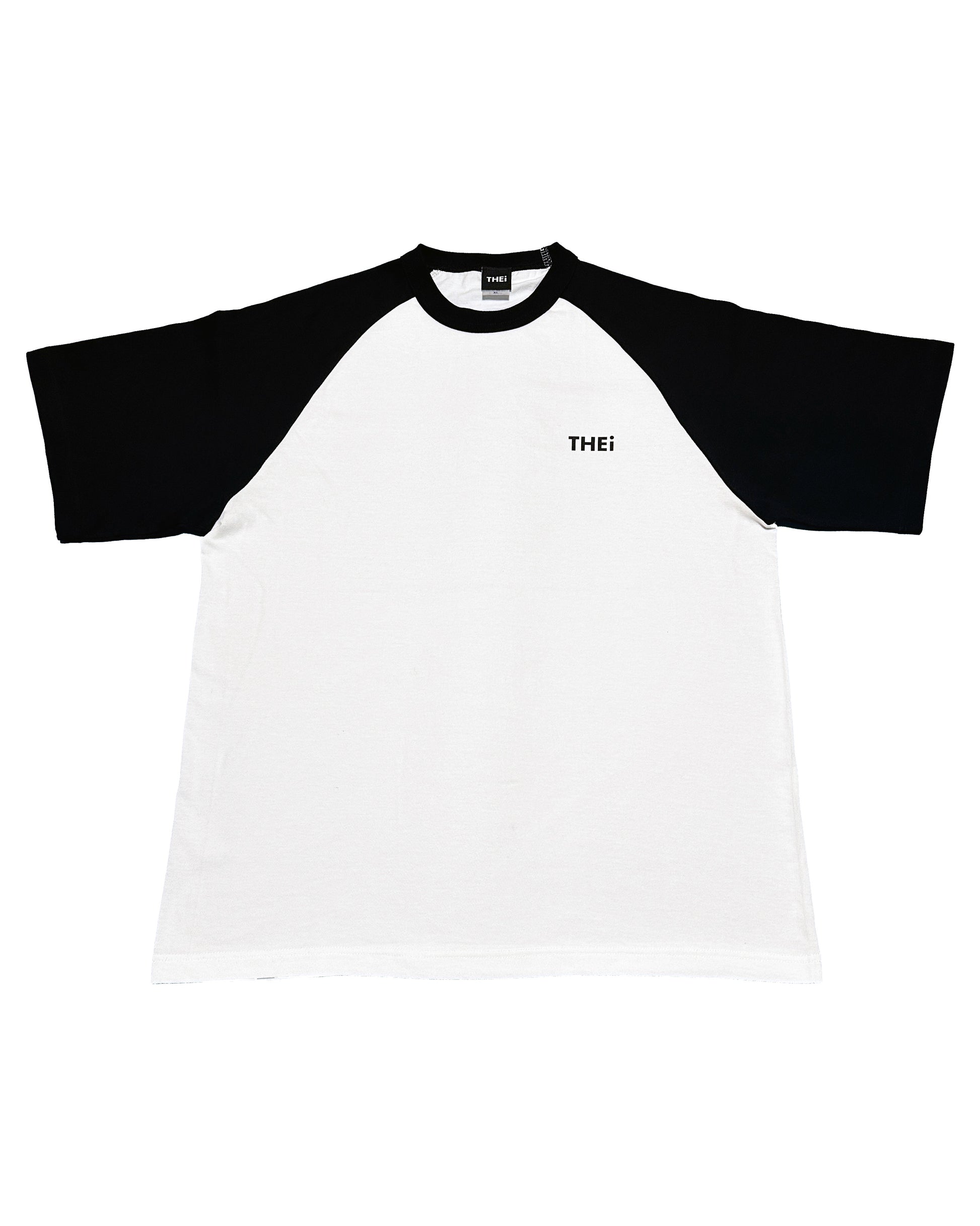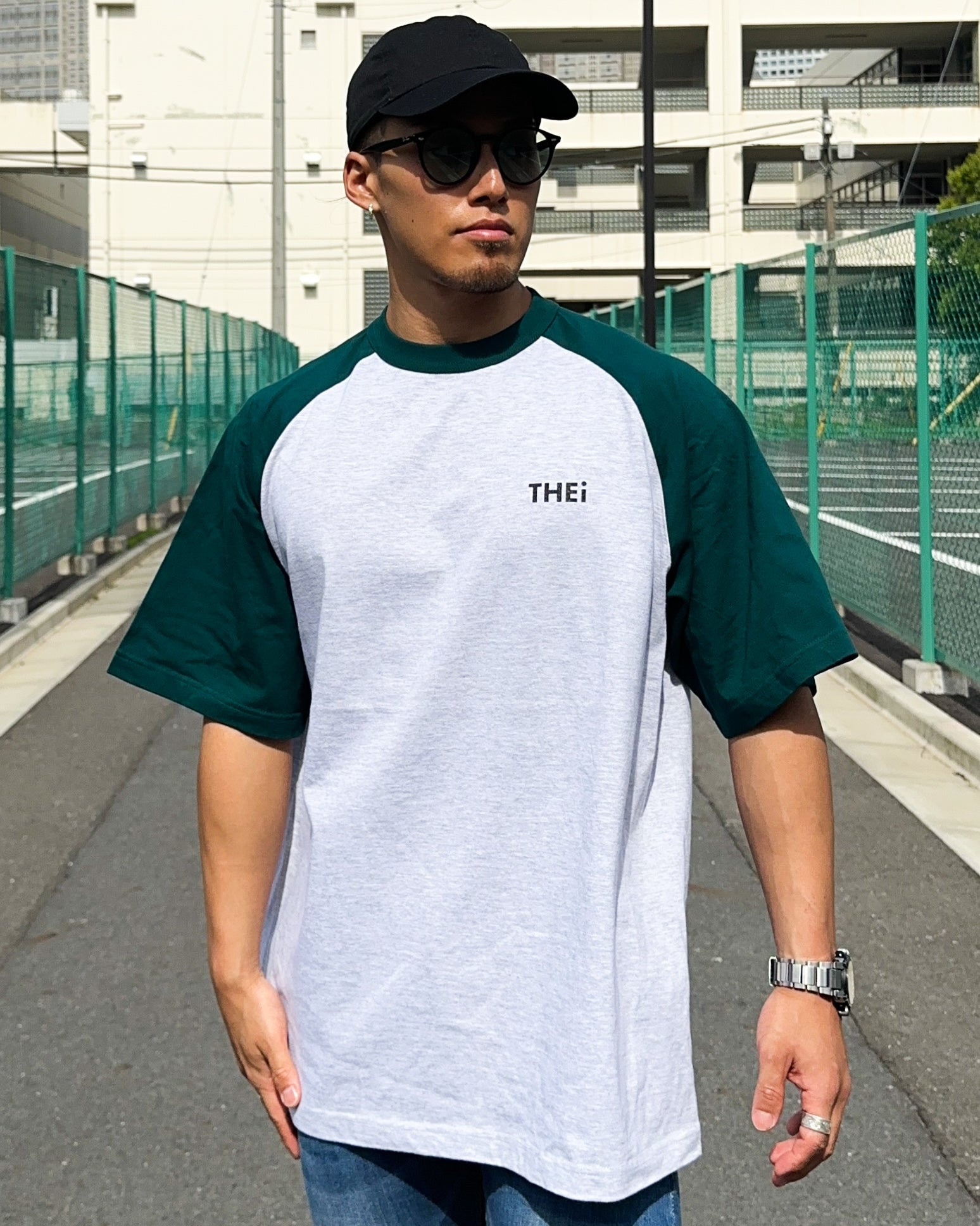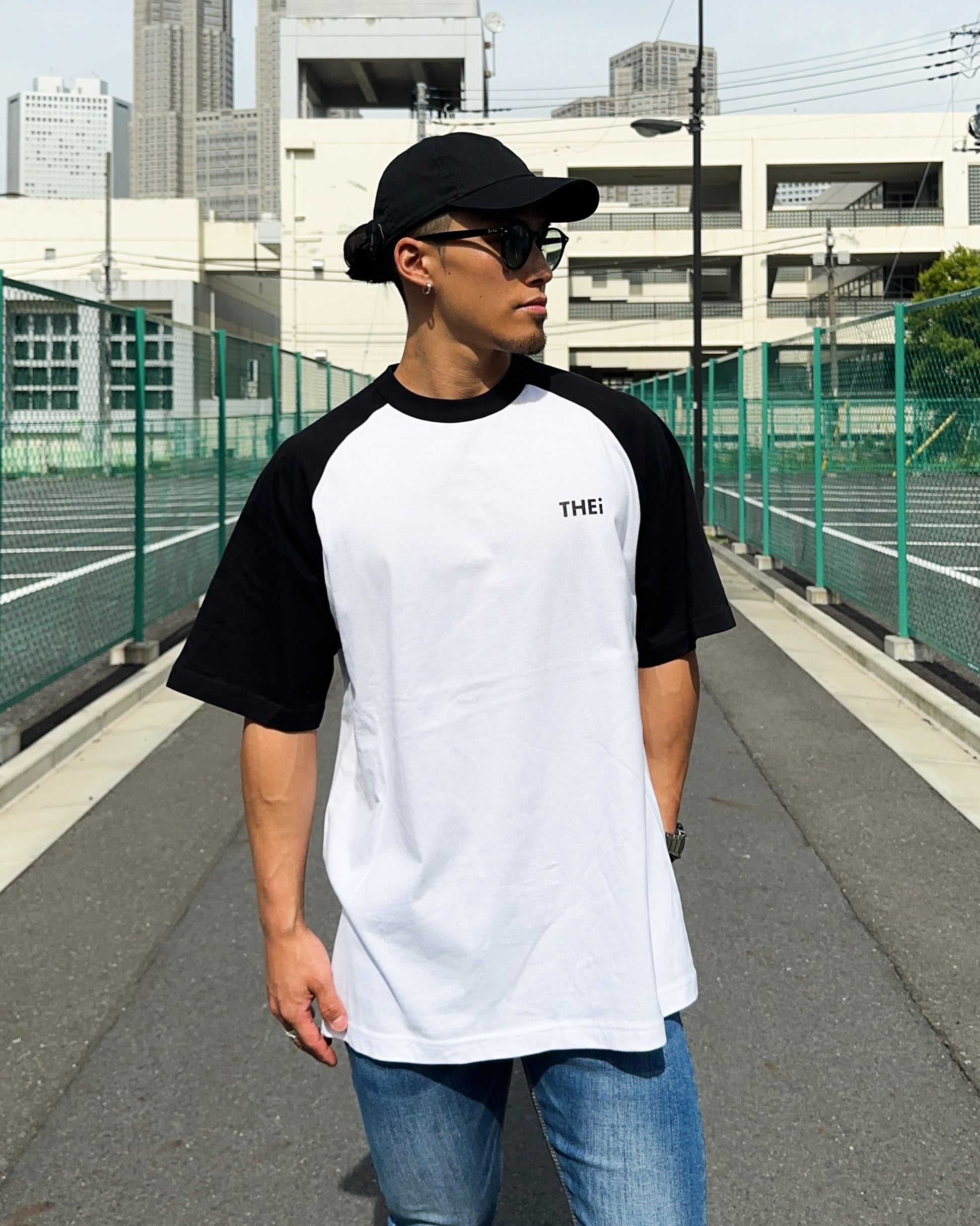 THEiのベーシックロゴを使用したラグラン半袖Tシャツ。