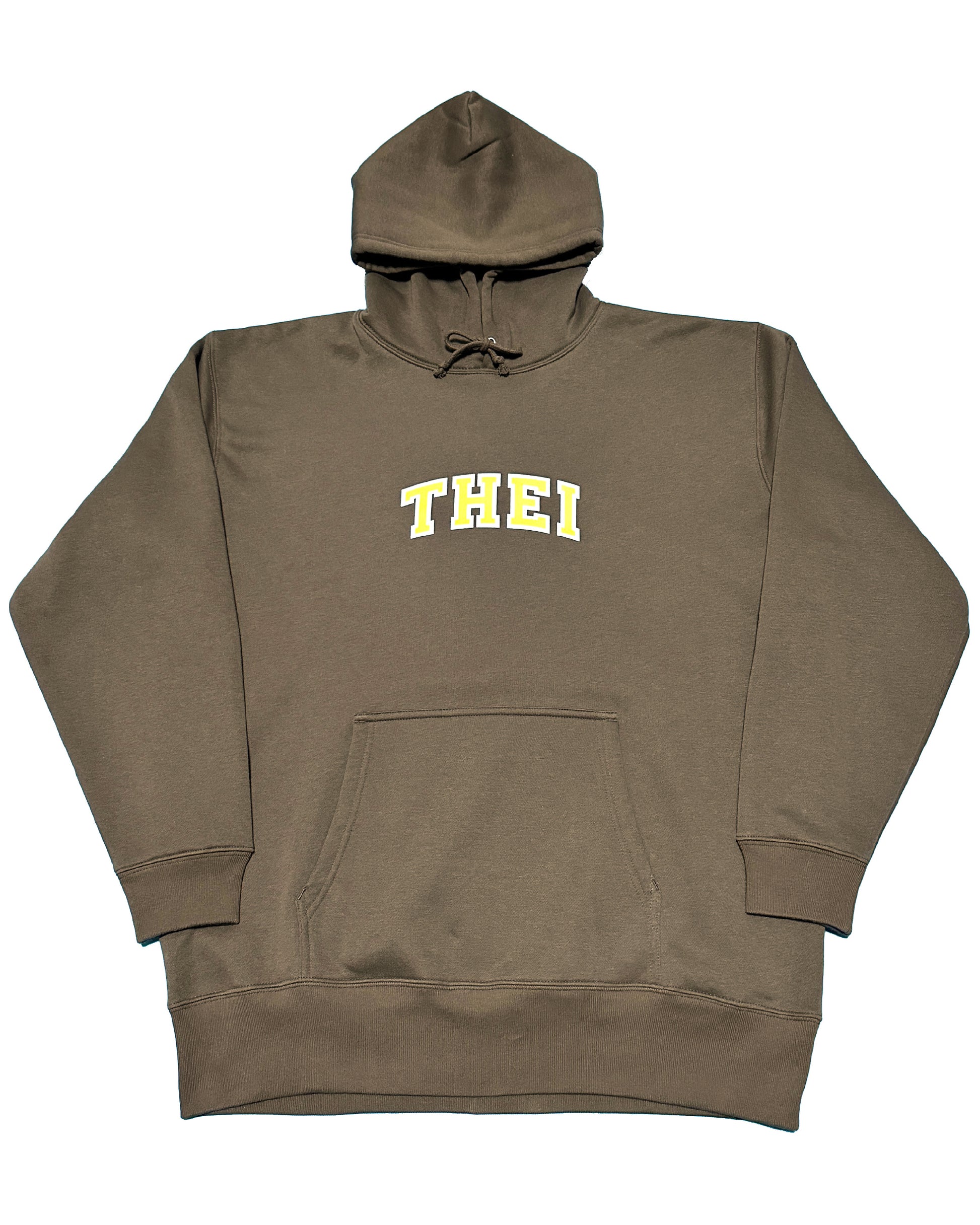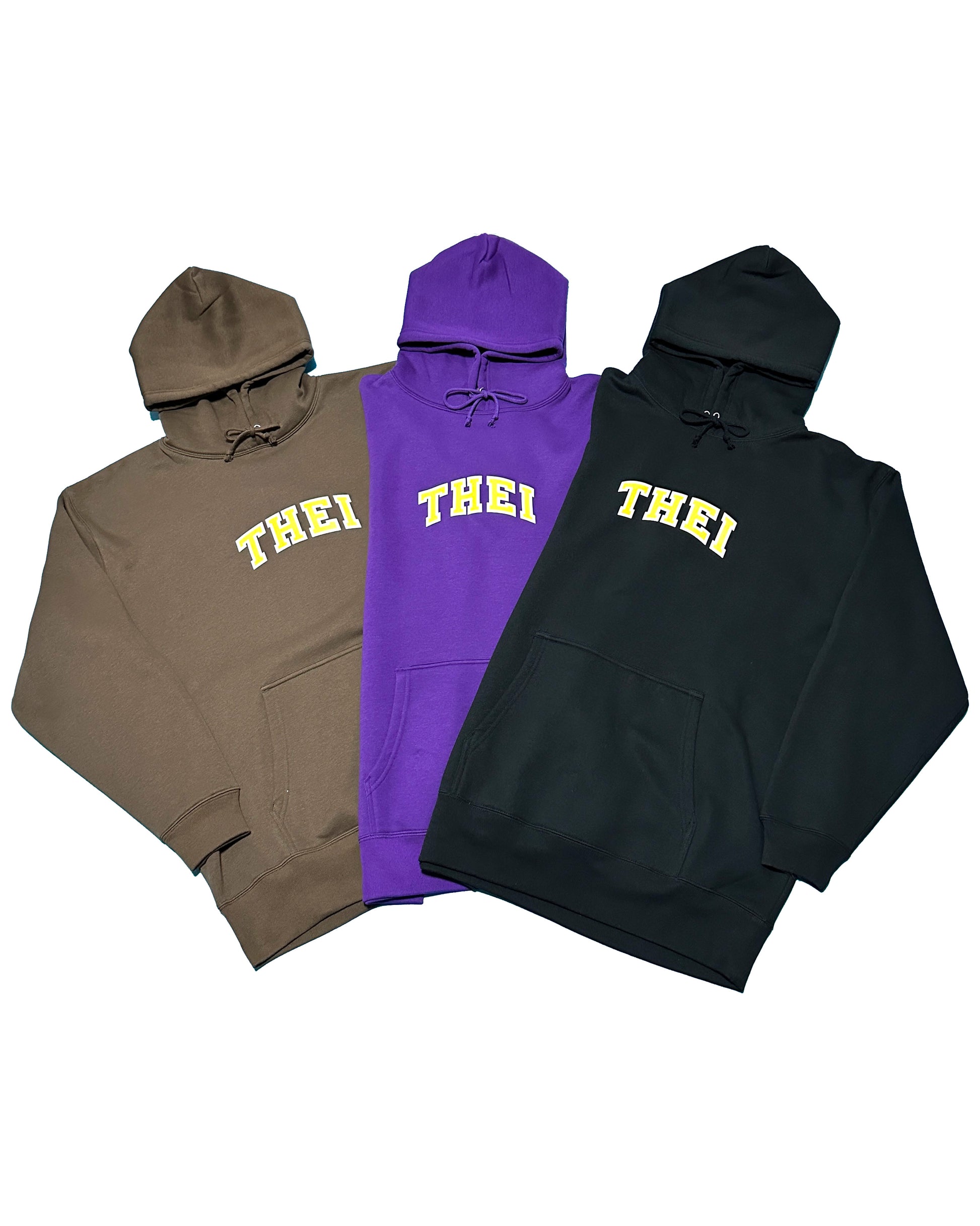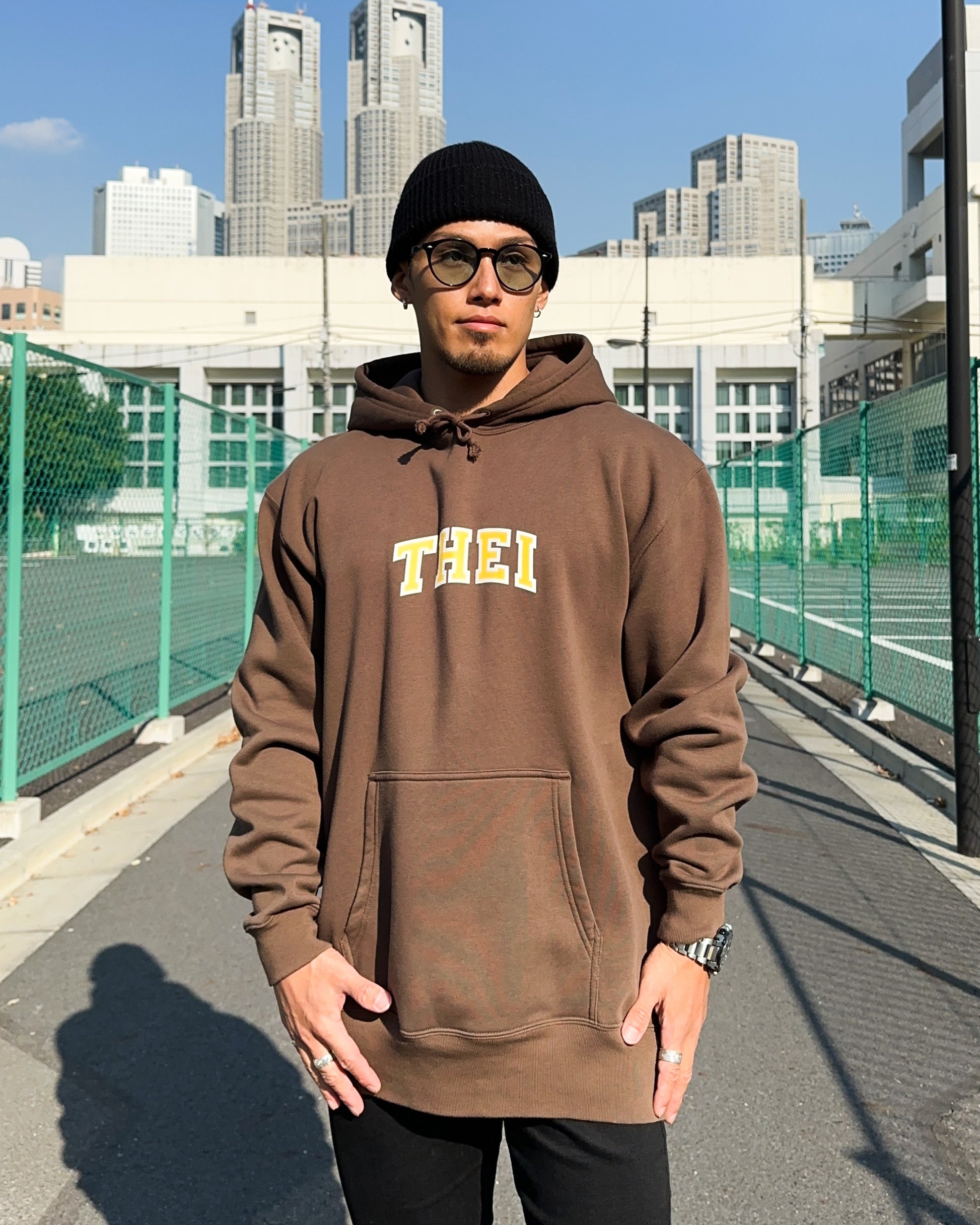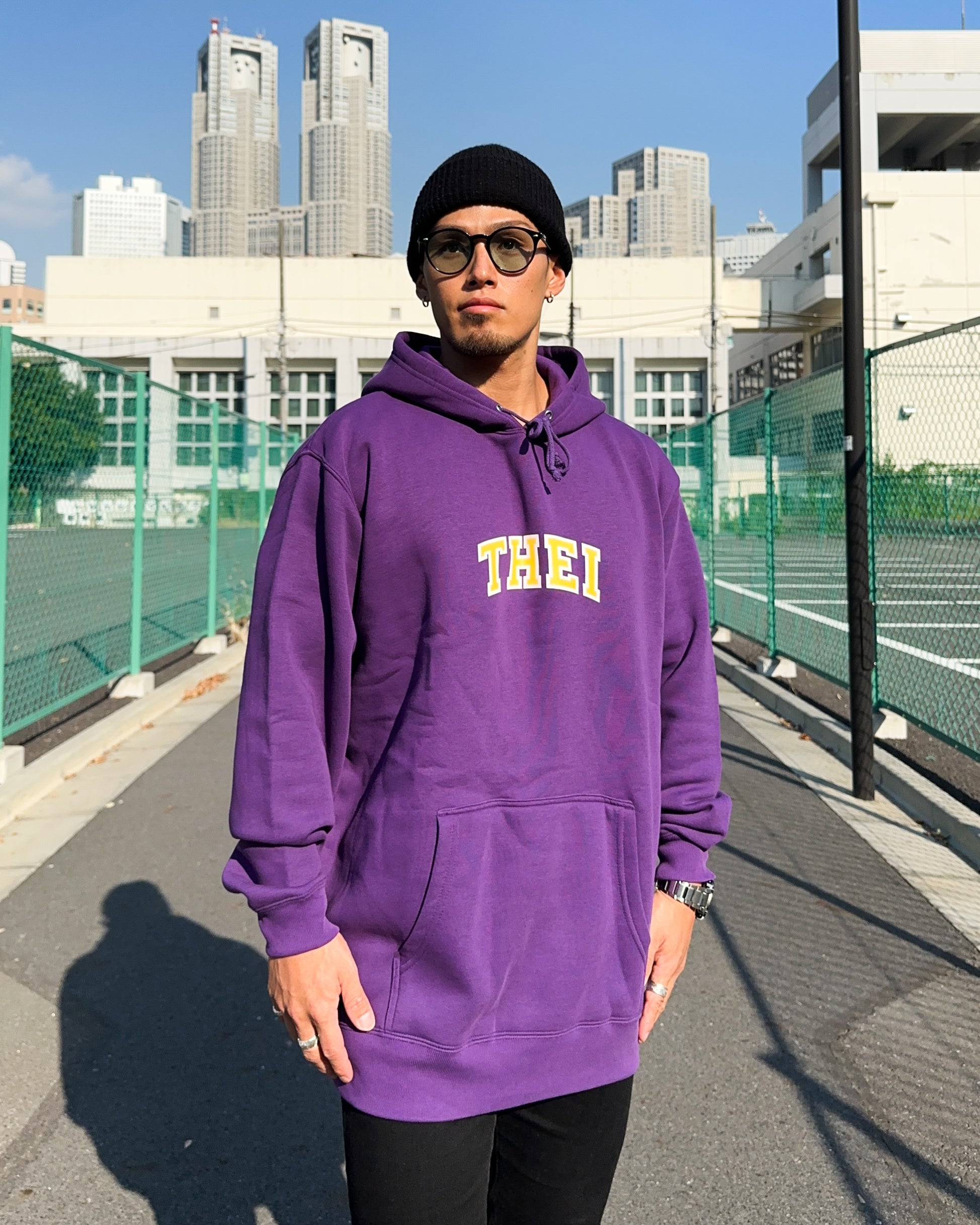 THEiのカレッジロゴを使用したスウェットプルオーバーパーカー。