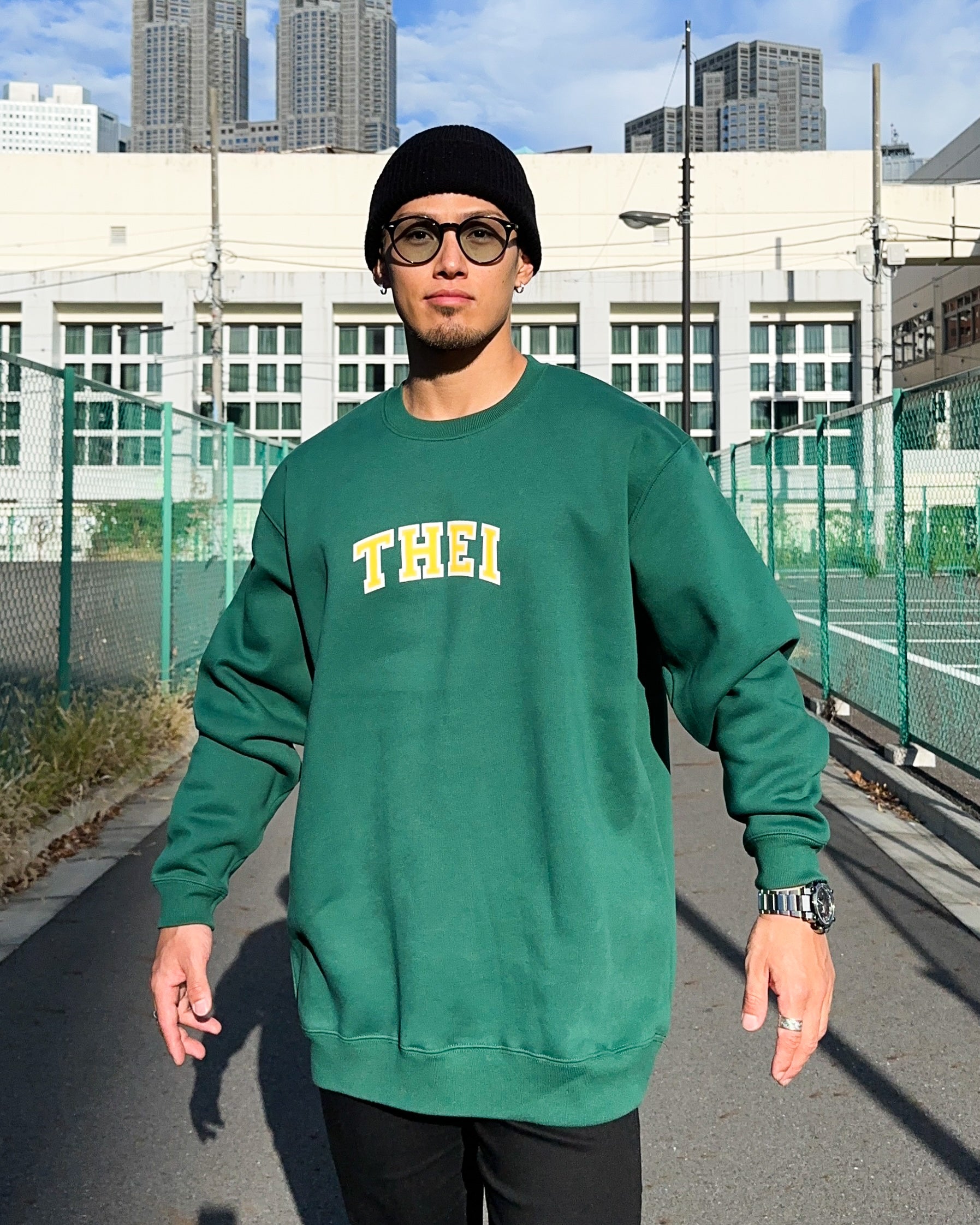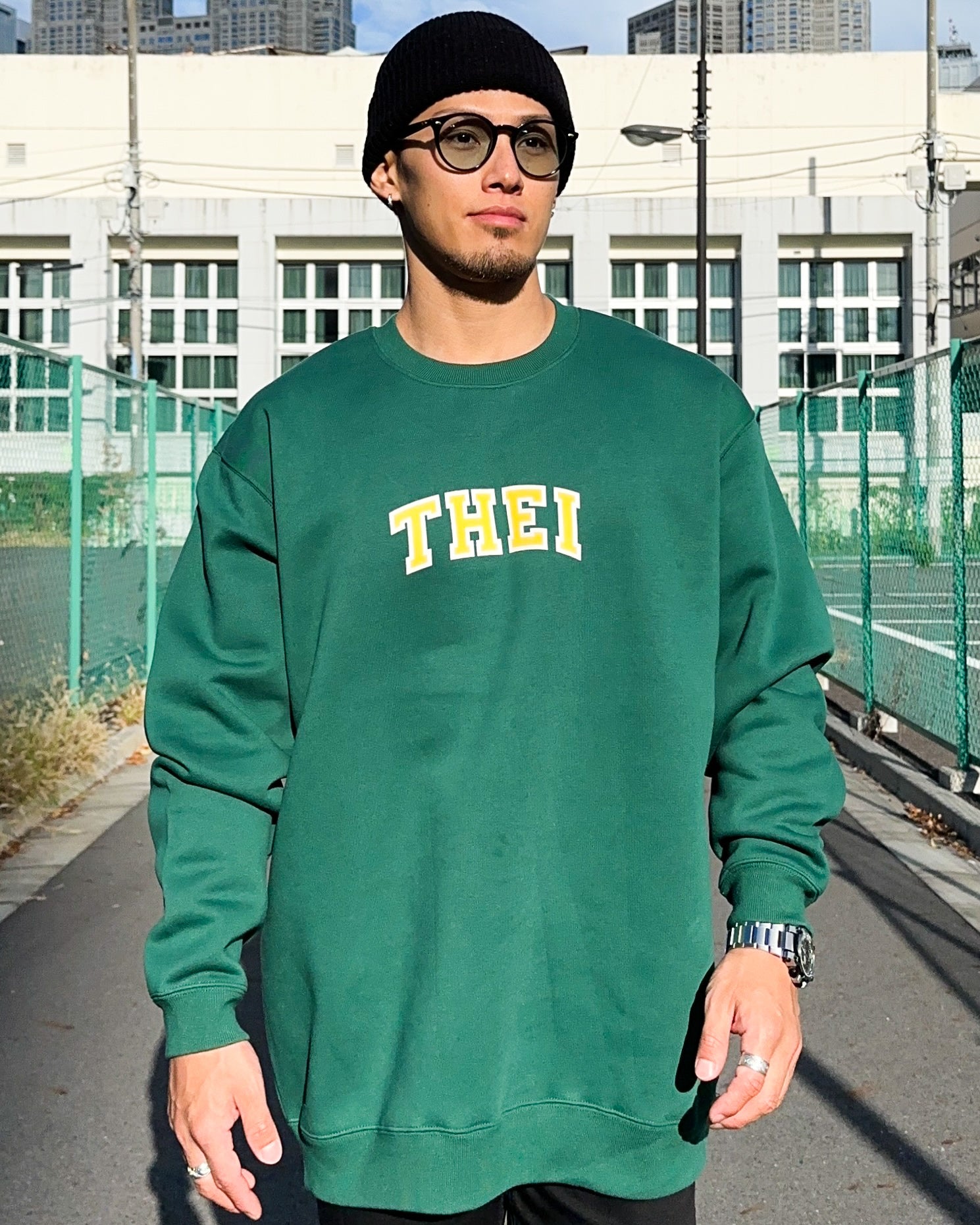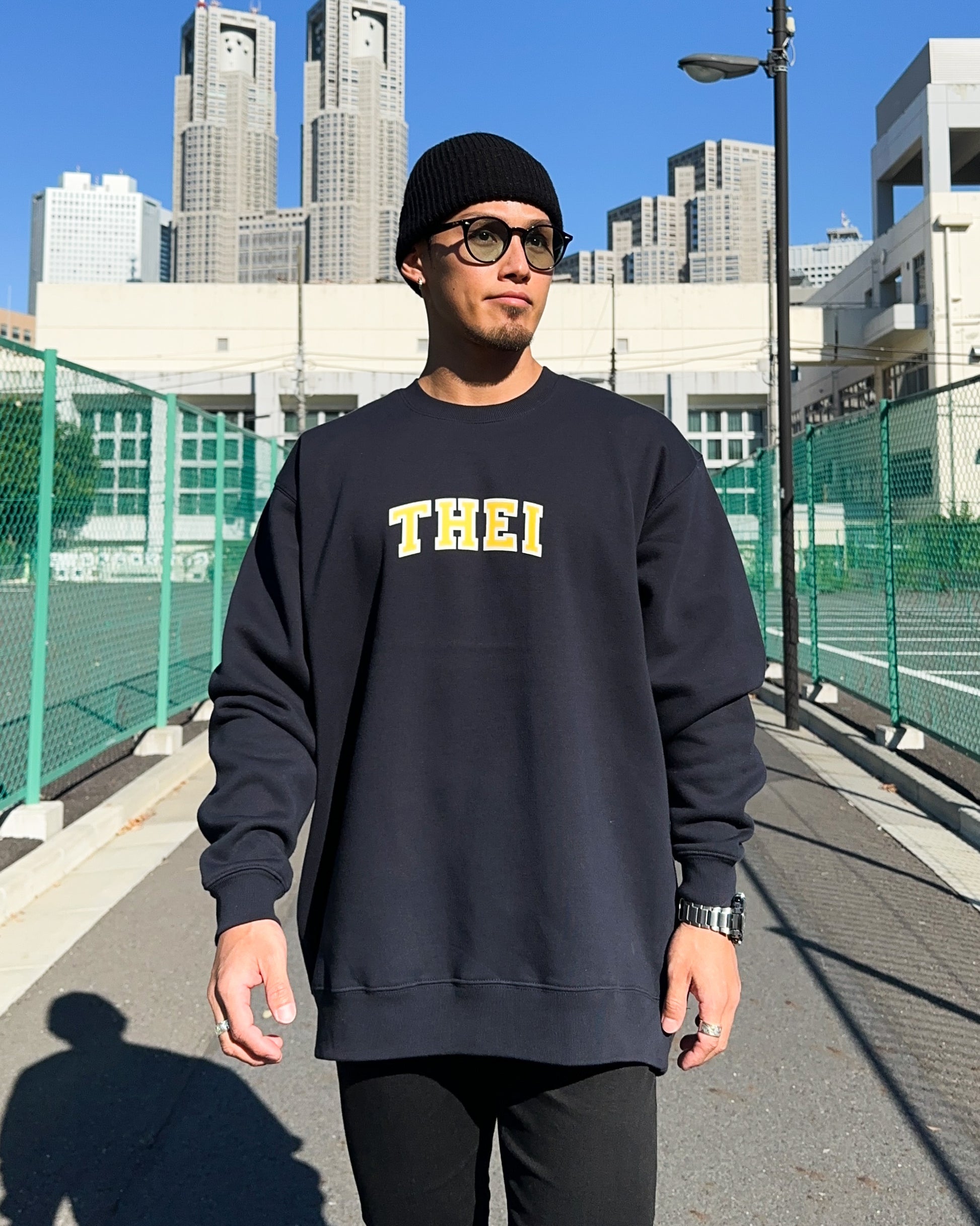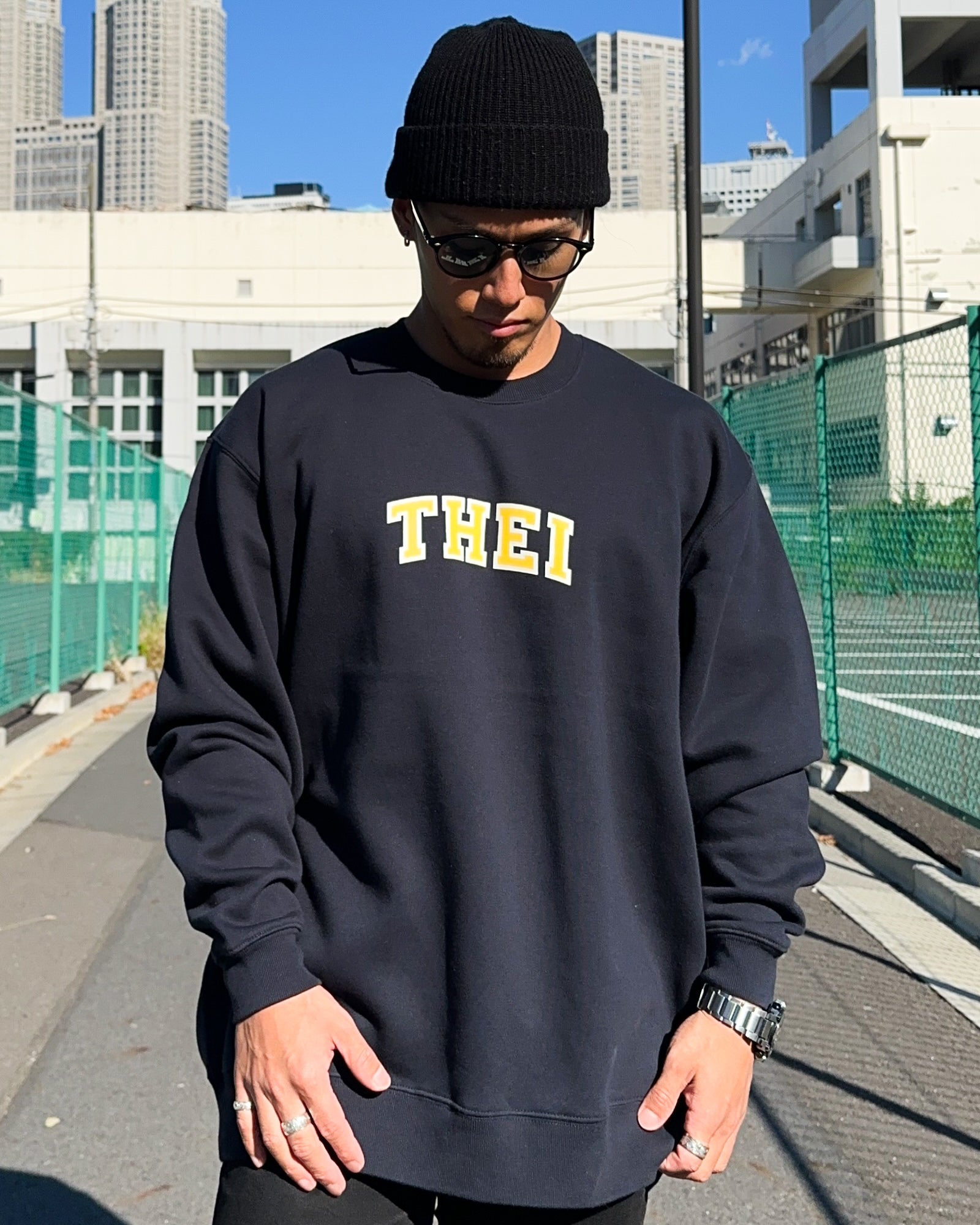 THEiのカレッジロゴを使用したスウェットシャツ。