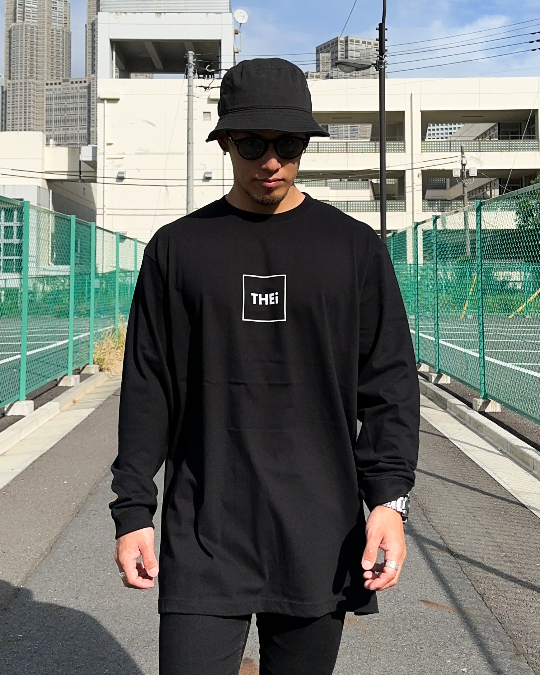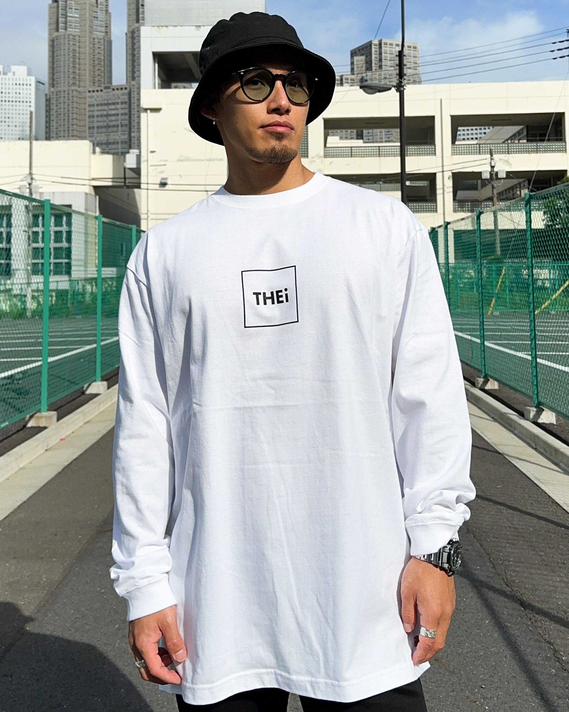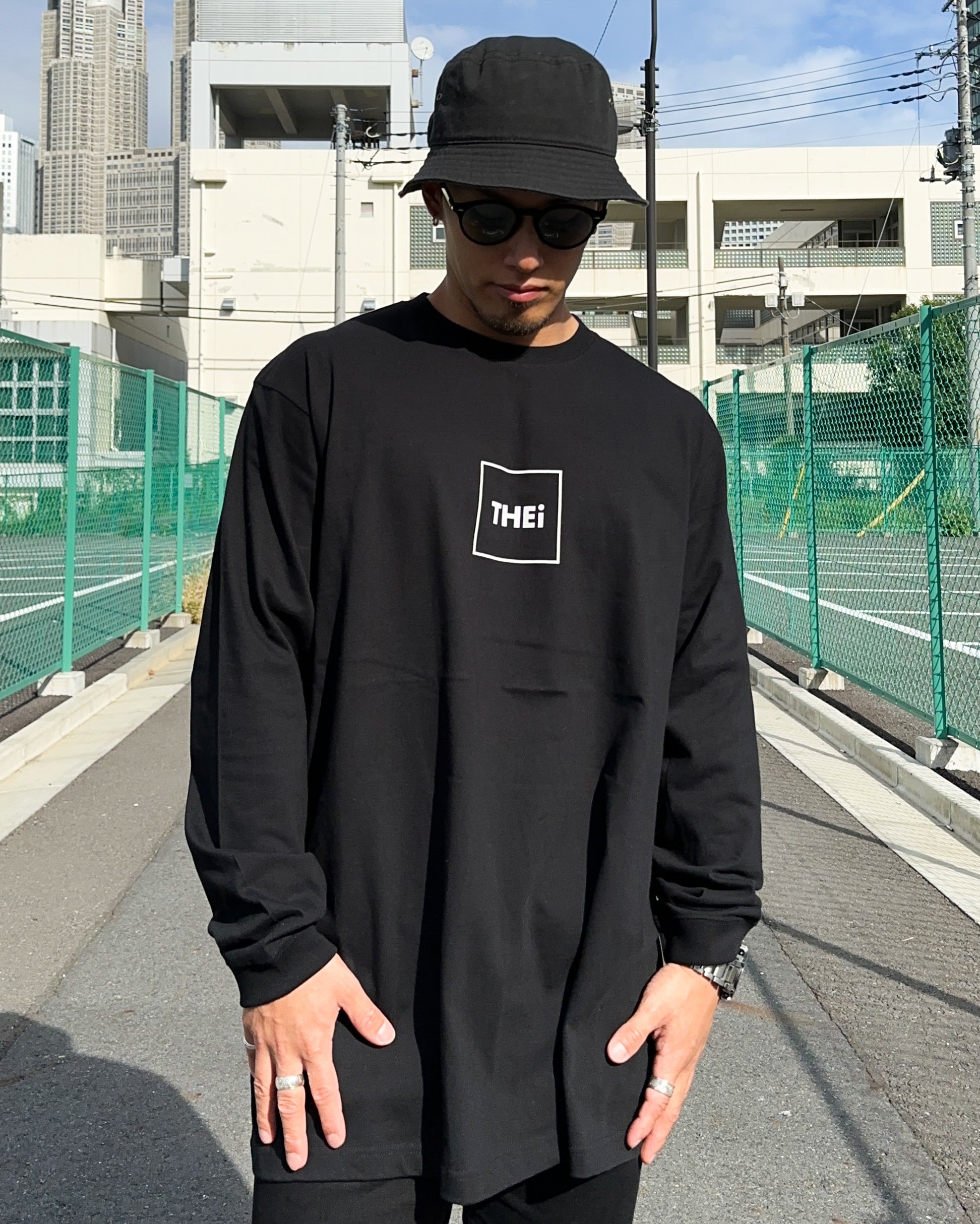 THEiのフレームロゴを使用した長袖Tシャツ。