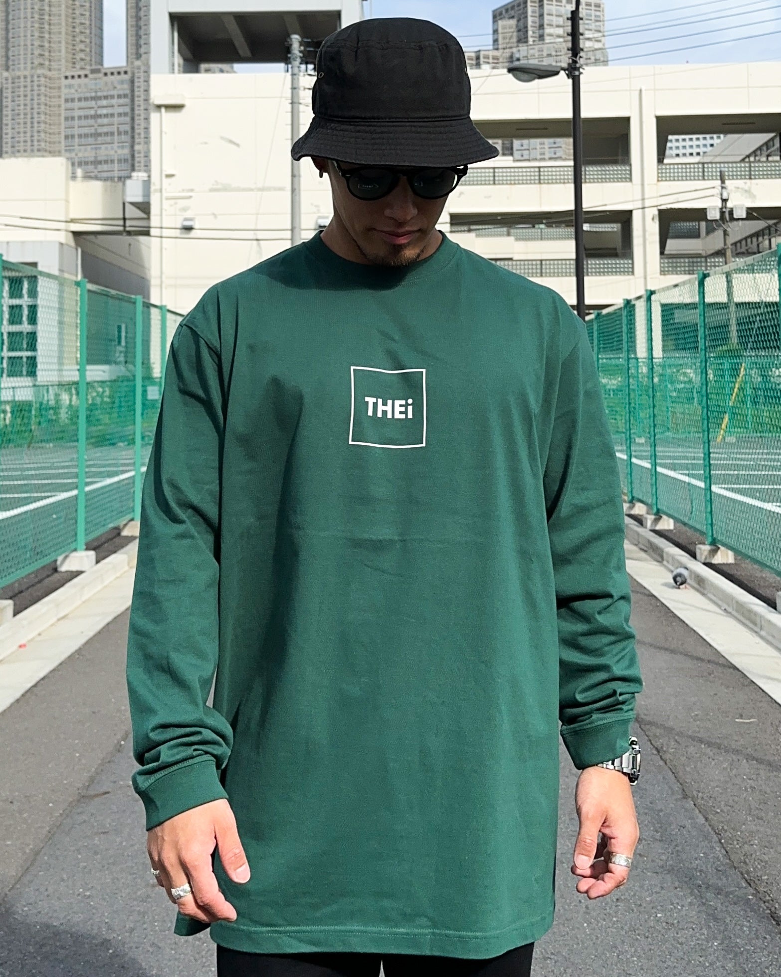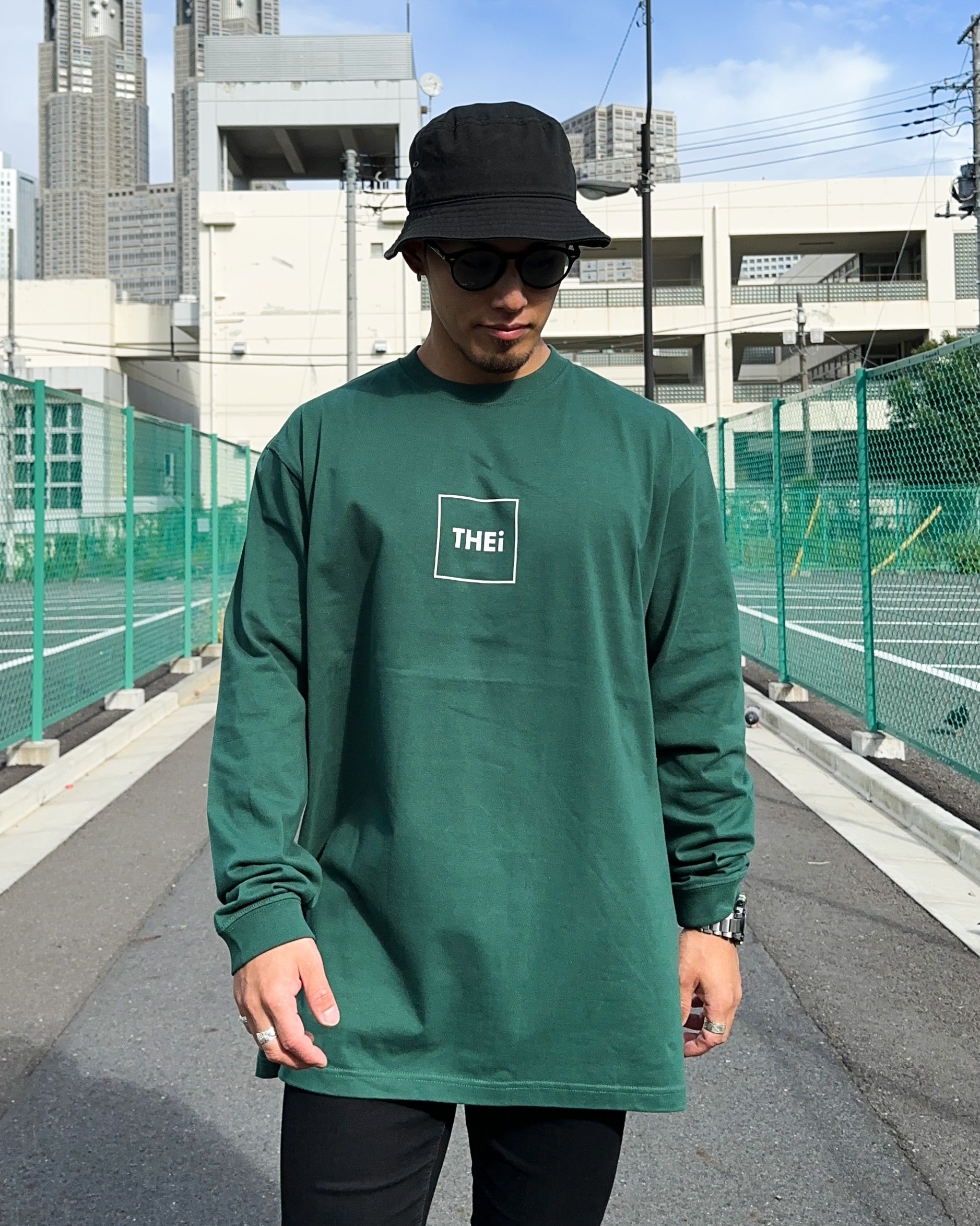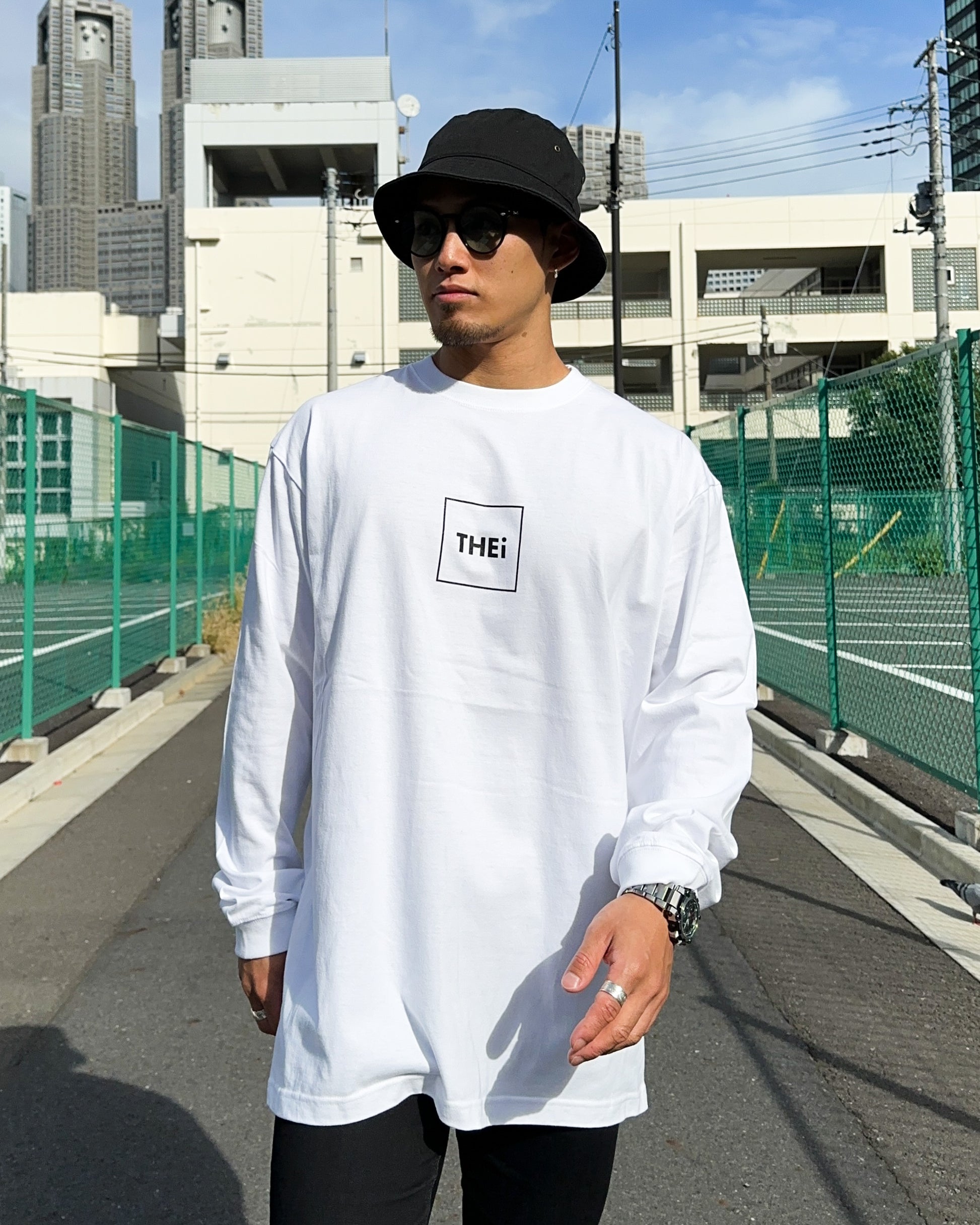 THEiのフレームロゴを使用した長袖Tシャツ。