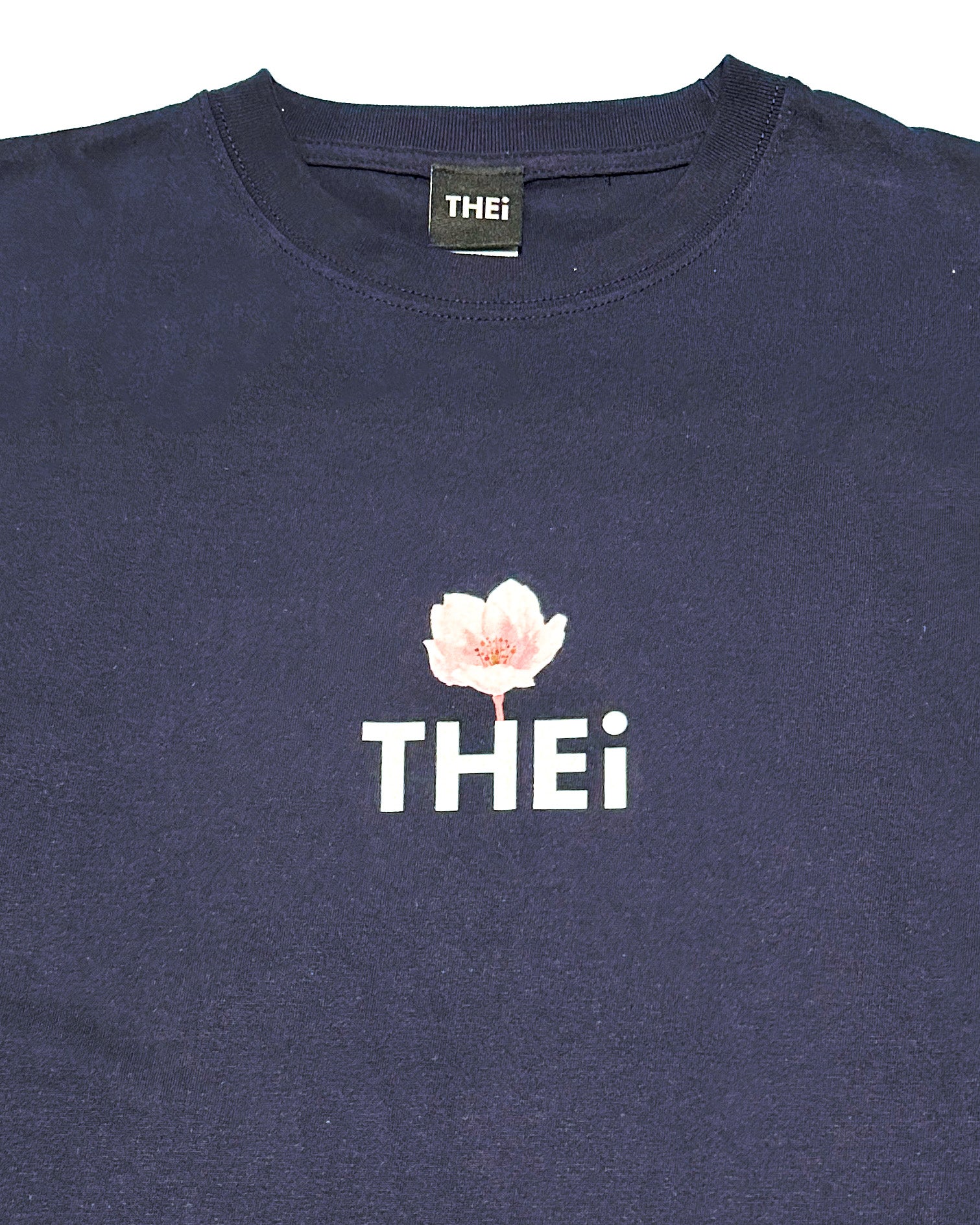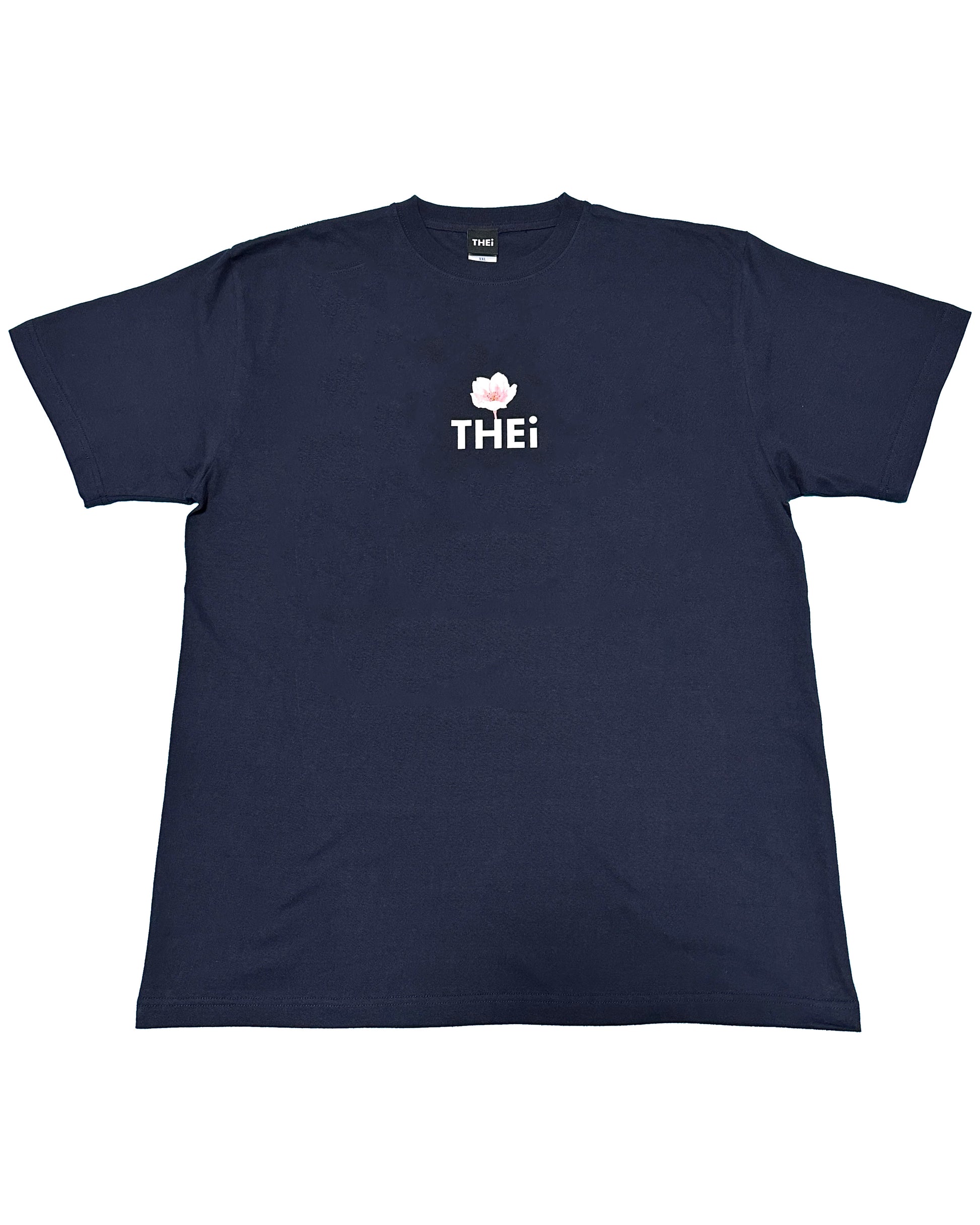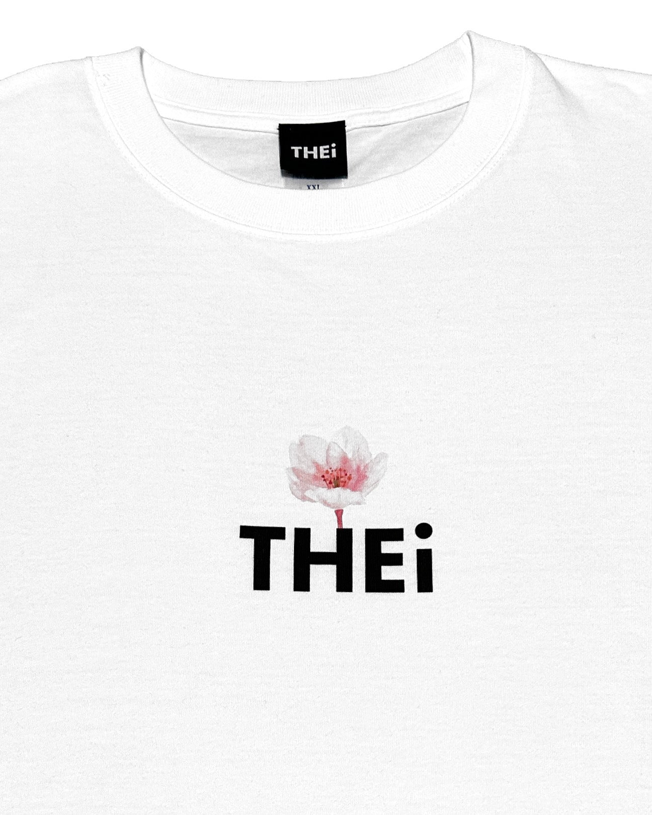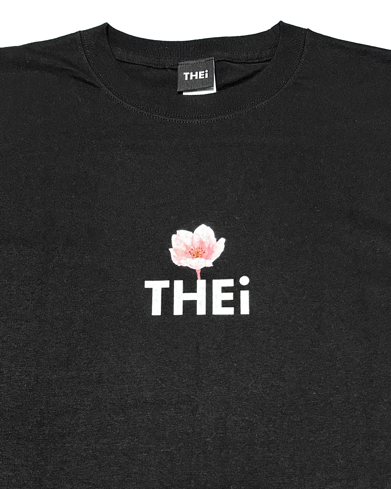 THEiのベーシックロゴの後ろに、桜の花の水彩画を配置した半袖Tシャツ。