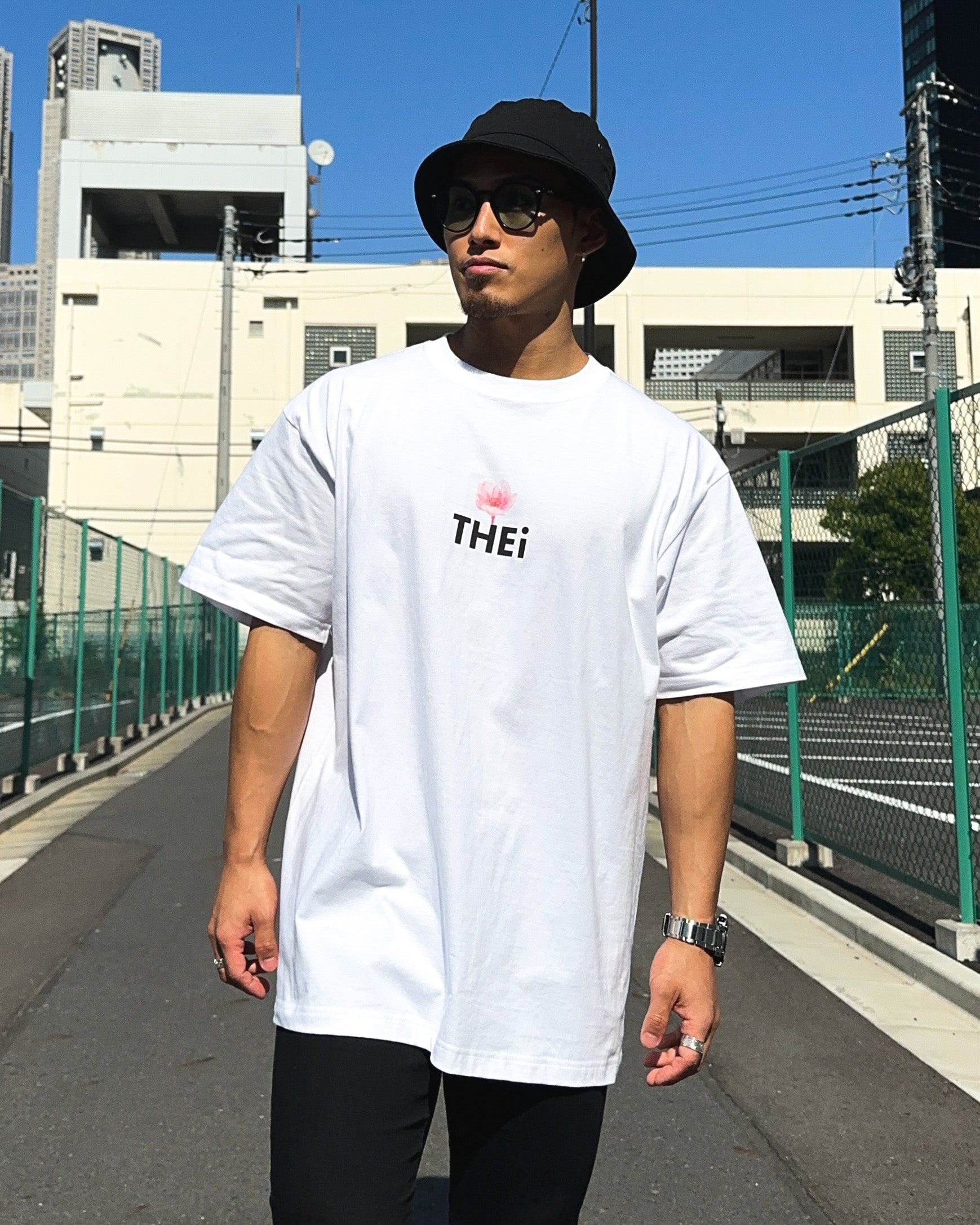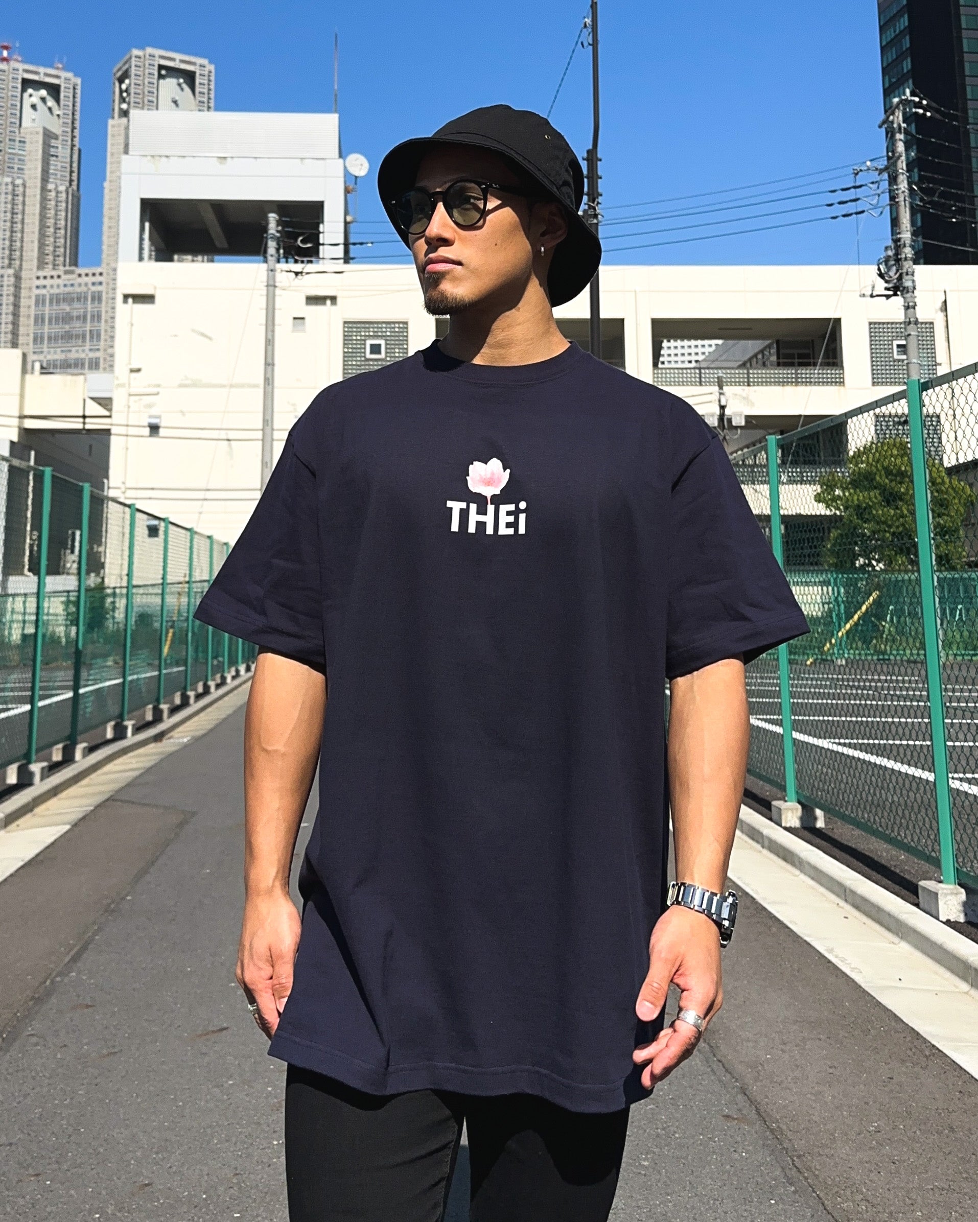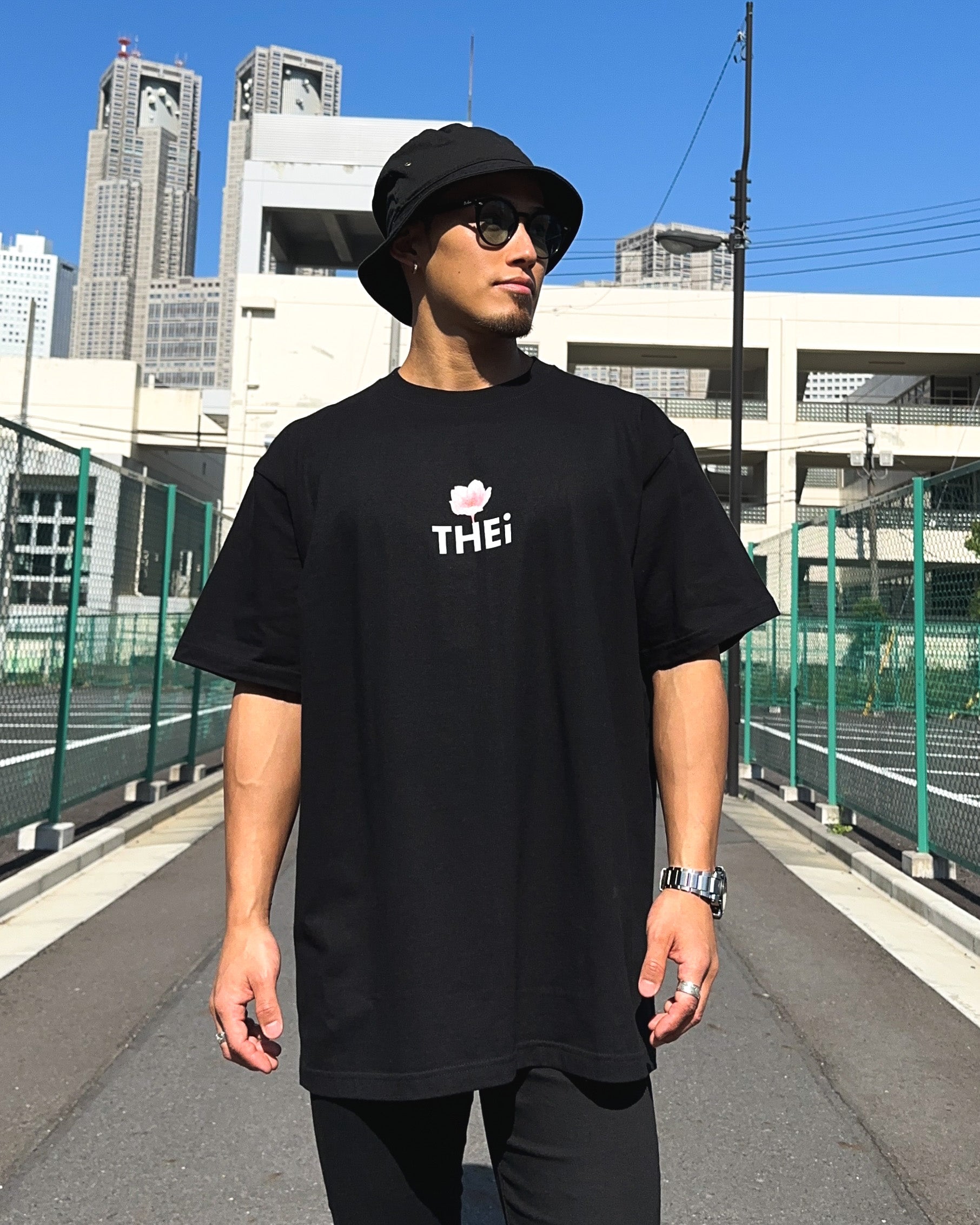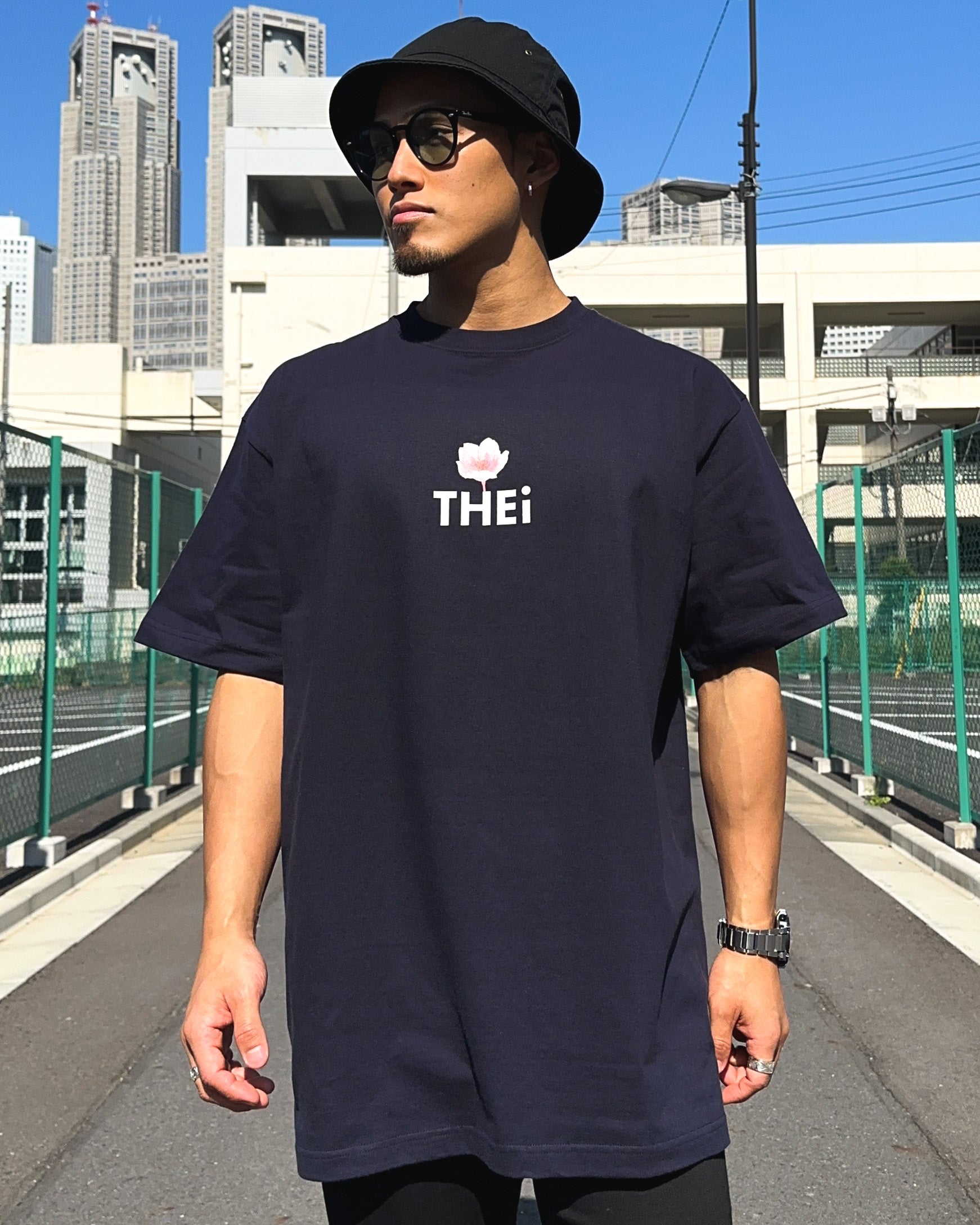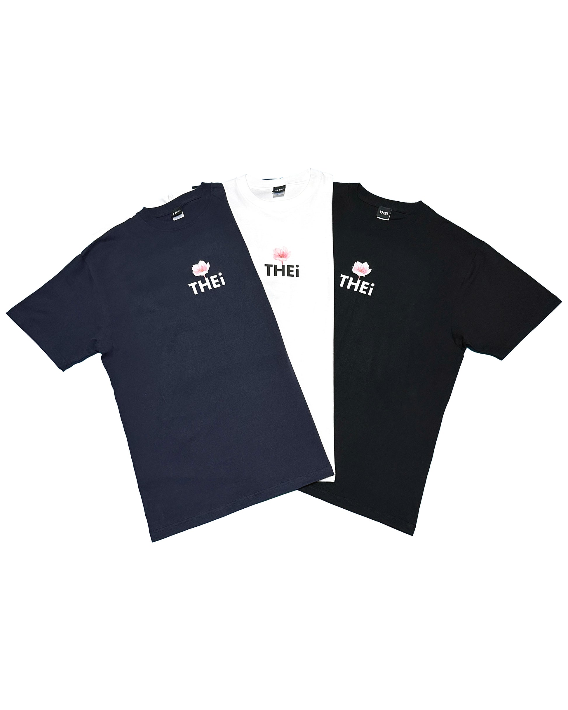 THEiのベーシックロゴの後ろに、桜の花の水彩画を配置した半袖Tシャツ。
